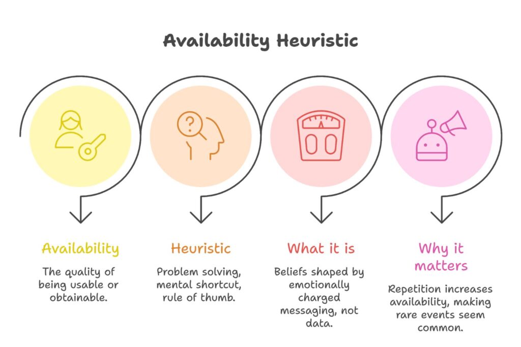 The gap between what is true and what is believed is a specific kind of cognitive bias called the Availability Heuristic, coined by psychologists Amos Tversky and Daniel Kahneman.